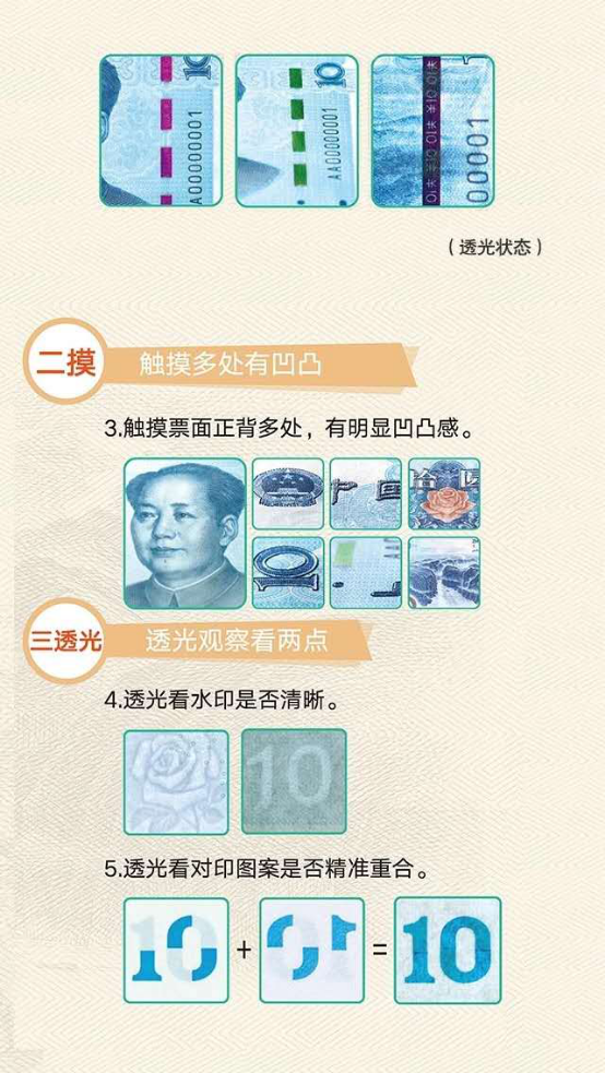 用手指触摸票面正面的毛泽东头像、国徽、“中国人民银行”行名、右上角面额数字、盲文及背面主景图案等处,有明显的凹凸感。