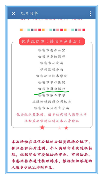 此次竞答活动,旨在献礼新中国成立70周年,弘扬宪法精神,礼赞我的祖国,得到了哈密市各区县、各部门、各单位全民动员、积极组织、踊跃参与、广泛宣传,收到14924份有效成绩。经过评审,评选出个人一等奖10名、二等奖20名、三等奖30名、鼓励奖40名,优秀组织奖10名。个人受表彰中,哈密市商业银行2名员工获得三等奖、1名员工获得鼓励奖。