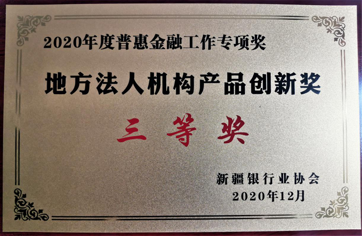哈密市商业银行荣获新疆银行业协会2020年普惠金融工作成效评比产品创新三等奖