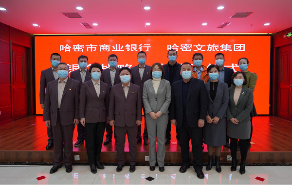 12月22日,哈密市商业银行与哈密东天山文化旅游投资集团有限公司(以下称文旅集团)在哈密市举行银企战略合作签约仪式。哈密市文化体育广播电视和旅游局党组副书记、局长常彩霞应邀出席;哈密市商业银行党委书记、董事长王黎群,党委副书记、行长宋良琴,党委委员、监事长、工会主席任雪峰和副行级领导;哈密文旅集团党支部书记、董事长许斌,党支部副书记、总经理彭小华,副总经理阎洁和东天山景区、大海道景区、文创园公司总经理;以及哈密市商业银行机关和营业管理部相关负责人参加签约仪式。签约仪式由哈密市商业银行党委委员、董事会秘书、副行长侯春亮主持。