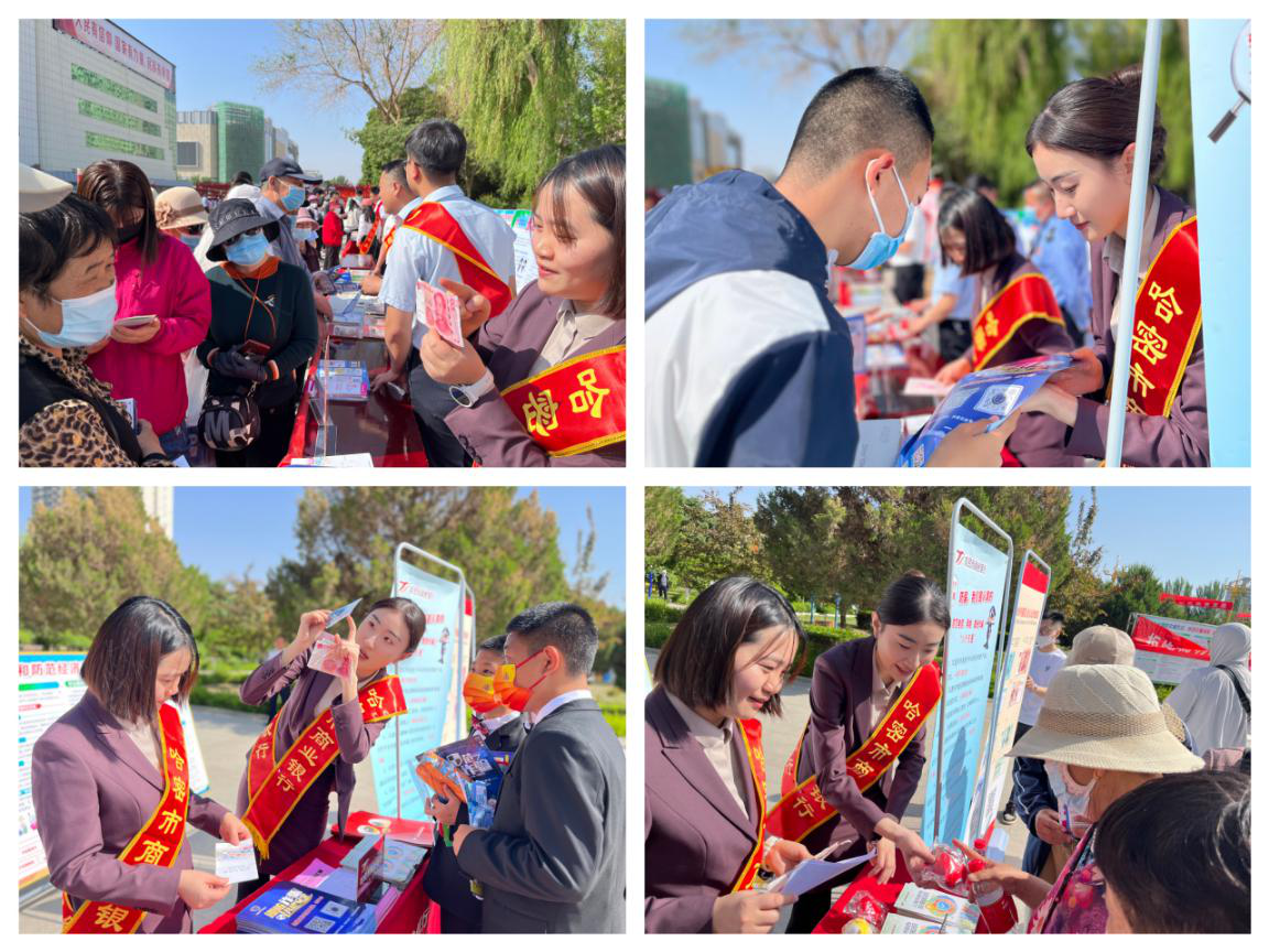 我行工作人员在哈密时代广场设立宣传展台并悬挂横幅,现场发放宣传折页并进行答疑宣讲,对来往居民进行现场讲解假币流通的危害,并现场指导他们如何识别假币。各营业网点在大厅开展金融反诈微沙龙,对前往柜台办理业务的客户宣传防范电信网络新型诈骗的基本知识,提醒客户增强风险防范意识、网络金融安全意识和自我保护意识,并对客户提出的相关问题做了详细的解答。