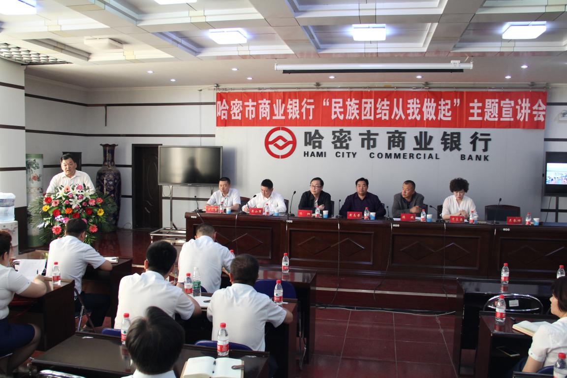 5月11日下午,哈密市商业银行召开“民族团结 从我做起”主题宣讲报告会,市国资委党委副书记、纪检书记黄志荣,市民宗委副主任张斌,市伊州区团结社区党支部书记吴承功受邀参加此次报告会,行领导班子成员、中层领导及各族职工共计 91人参加,乌鲁木齐分行通过视频参会。会议由副行长黄小军主持。